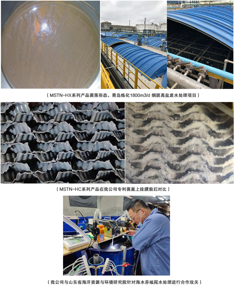 我公司从特定的高盐环境中筛选、驯化、培育出了可针对性处理不同污染物质的耐高盐系列菌剂,该系列菌剂可耐受78,000mg/L(7.8%wt)的高盐环境,主要包括:MSTN-HX系列、MSTN-YF系列、MSTN-HC系列、MSTN-CP系列,以上菌剂分别可以处理高盐废水中的氨氮、TN、COD、TP等污染物质,将污染物质转化为无害、稳定的N2、CO2和H2O等排出系统。